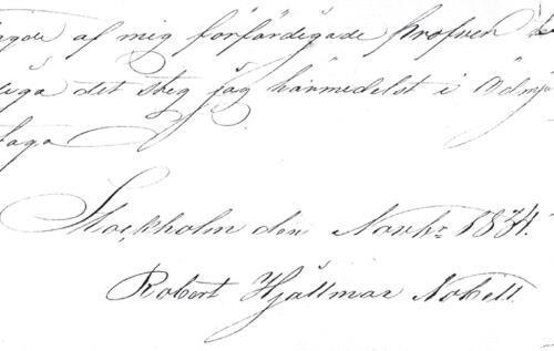 Дело о рассмотрении патентных заявок Иммануила содержит несколько странных моментов. В Отношении Коммерц-коллегии о состоянии фабрик и мануфактур на 1835 год читаем, что Роберт Яльмар Нобель получил патент на десять лет «за изобретение по производству эластичных тканей, лент и полос, а также за изобретение по производству, посредством растянутого каучука, воздухонепроницаемых тканей и сосудов». Роберт Яльмар, а не его отец, Иммануил, который все это придумал… Хранящаяся в Национальном архиве Швеции патентная заявка действительно подписана Робертом Яльмаром Нобелем, которому на тот момент было шесть лет от роду.