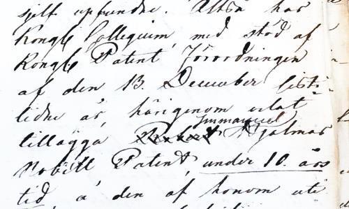 Таким образом Королевская Коммерц-Коллегия предоставила «Иммануилу Яльмару Нобелю» патентное свидетельство с привилегией на десять лет «за изобретение по производству эластических тканей и полотен, <…> а также за <…> изобретение по производству воздухонепроницаемых тканей и сосудов».