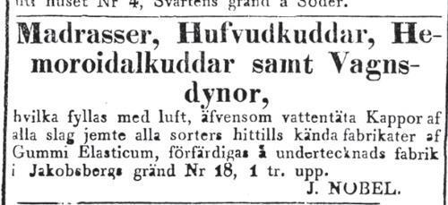 В том же году Иммануил подал прошение о возможности использовать принадлежащее Коммерц-коллегии помещение для производства эластичных тканей. В качестве мотивировки упоминалось, что производство скипидара, необходимое для подготовки резины, пойдет на пользу северным областям Швеции. К прошению прилагались список из девяноста четырех товаров и четыре листа с образцами эластичных тканей. Сюда же прилагались пространные свидетельства знаменитого химика Якоба Берцелиуса, где он пишет, что, опираясь на свой опыт, находит продукты Нобеля «столь же качественными, сколь и заграничные фабрикаты того же рода» и что «его методы использования каучука, частично им лично разработанные, свидетельствуют о хорошей изобретательности и о живом уме». Несмотря на лестный отзыв Берцелиуса, дело попало в долгий ящик. А когда помещение наконец стало доступным, то, как увидим, вопрос уже потерял для Иммануила актуальность.
