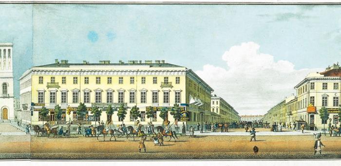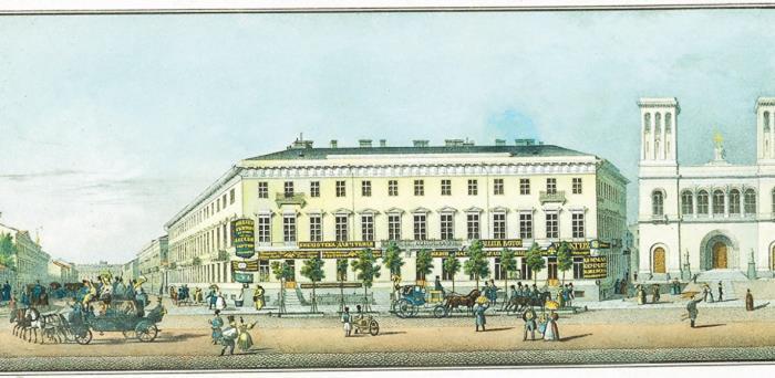 Великолепный вид, который встретил Иммануила по приезде в Санкт-Петербург: Невский проспект у Немецкой церкви. Справа – улица Малая Конюшенная, где находилась шведская церковь и проживали шведы и другие выходцы из скандинавских стран. Акварель 1828 года. Неизвестный художник