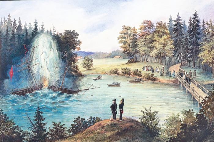 Акварель Иммануила, на которой изображено, как судно с турецким флагом подрывается на подводной мине. Двое мужчин, наблюдающих за успешным экспериментом, – сам Иммануил и, предположительно, великий князь Михаил Павлович