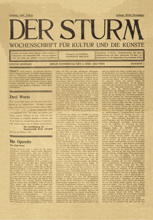 Первый номер журнала, вышедший 3 марта 1910 года, имел газетный формат и был напечатан на газетной бумаге. Но при этом «Штурм» выглядел весьма стильно благодаря графическому образу, который придумал для него австрийский художник Оскар Кокошка (в дальнейшем это обстоятельство поможет Вальдену проложить путь в мир изобразительного искусства).