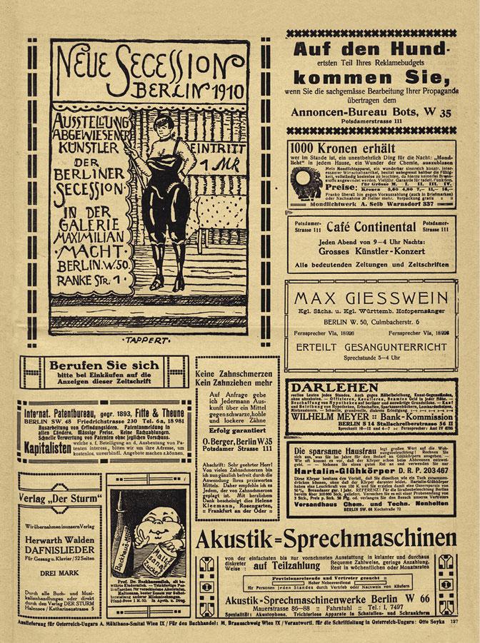 Нельзя не признать, однако, что быстрое развитие «Штурма» все же происходило благодаря энергии самого Вальдена, который делал все, к чему прикасался, по воспоминаниям знавших его, «с обворожительной страстью и непреклонным упорством»12. Всего через пару месяцев после выхода в свет первого номера журнал имел уже 4000 подписчиков и печатал четыре страницы рекламы, что давало шанс продолжить дело. Об этом не без некоторого удивления и гордости Вальден сообщает в письме Краусу в июне 1910 года13.