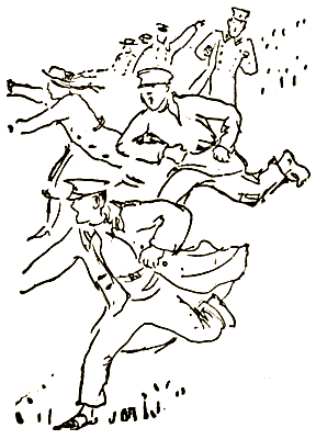 В обществе шести незнакомых ребят Яшка бросился опрометью бежать от забора через темное поле.