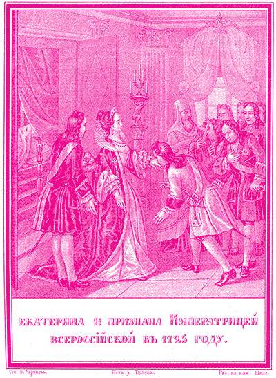 Воцарение. Петр умер 28 января 1725 г., не назначив себе преемника. Однако люди, которым предстояло распорядиться брошенной короной, не остались без указания, как поступить. Как ни туманно изложен устав 5 февраля, он заключал в себе и свое толкование, сопоставляя распоряжение Петра о престолонаследии с его же указом о единонаследии, как основанным на одинаковых соображениях и началах. А в этом указе установлен порядок наследования не только по завещанию, но и по закону, именно: при отсутствии сыновей наследует старшая из дочерей. Но старшая дочь Петра Анна, при обручении с герцогом Голштинским в 1724 г., в брачном договоре, под присягой отказалась вместе с женихом от русского престола за себя и за свое потомство. Законное наследство переходило ко второй дочери Петра – Елизавете. Ни на каком основании в очередь наследования не могла стать вдова императора: по указу 1714 г., как и по исконному русскому праву наследования, вдова-мать при детях обеспечивается и может опекать несовершеннолетних наследников, но не наследует. Однако, в исполнение закона, последовало то, что всего более ему противоречило.
