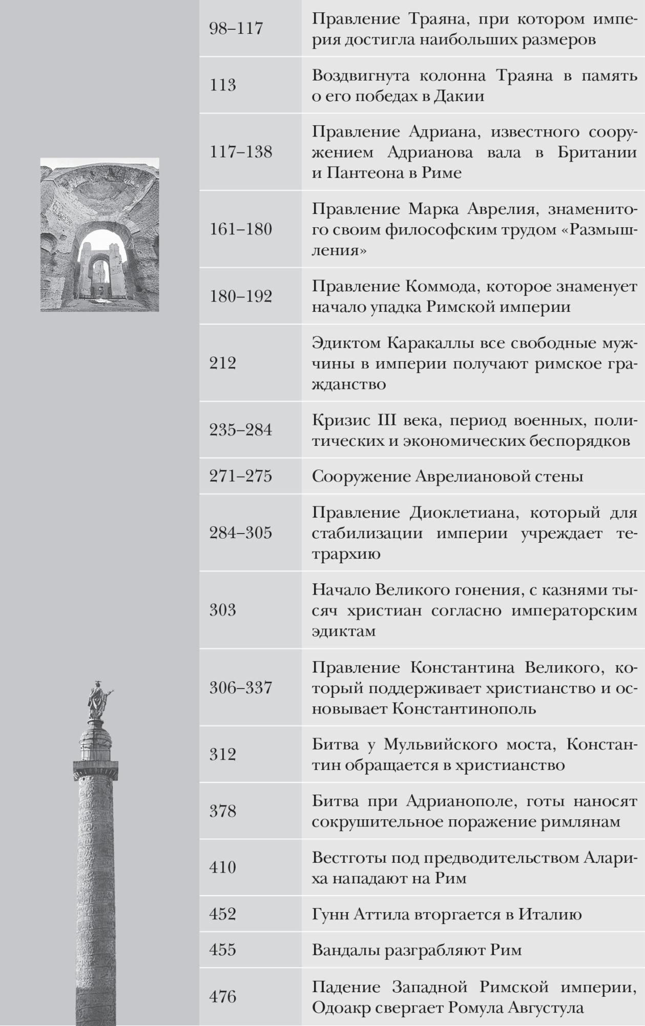От римлян осталось гораздо больше, чем загрязнение воздуха, серебряные монеты и затонувшие сокровища. Они также оставили нам свою политику, законы, философию, архитектуру и — для многих стран — основы или следы своего языка. Они дали нам римские цифры, дни недели, месяцы, водопроводы, напольное отопление и бетон. Наряду с греками, с которыми римляне находились в культурном симбиозе, они заложили политические, интеллектуальные и художественные основы западной цивилизации. Они были умелыми инженерами и блестящими военными тактиками. Римские врачи, привыкшие работать с ранами гладиаторов и с жертвами эпидемий, были пионерами медицины. Изобретение водонепроницаемого бетона — его делали из вулканического пепла, например с Везувия, — позволило римлянам воздвигать великолепные, вызывающие шок и трепет сооружения, а также строить гавани и порты, способствовавшие расширению торговли в дальние земли.