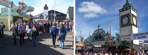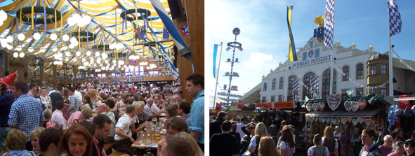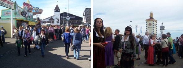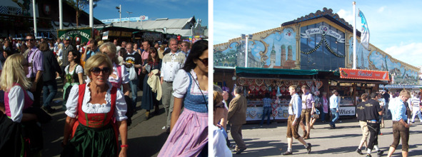 Пятница, 5 октября. Территория Луга Терезы, чтобы зрительно представить, почти в два раза больше Красной площади в Москве. По всему Лугу проходит основная улица Wirtsbudenstraβe, на которой расположено 12 палаток владельцев-производителей пива. Палатки оформлены празднично, с рекламой известных марок мюнхенского пива и продукцией, из которых готовятся блюда к столу. У палаток возвышаются ярмарочные столбы с флажками, рекламой и гербами фирм.
