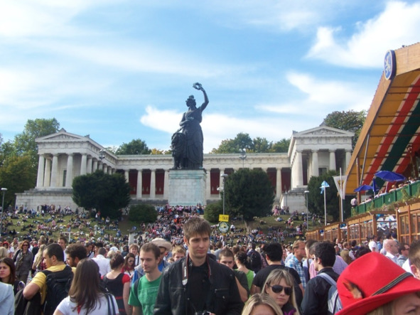 На следующий день, в субботу, народу на Терезином лугу было там много, что не протолкнуться. Покупая подарки, останавливаясь на развлечениях со свистками, мы едва пробрались к южным воротам, от них правее — к статуе Баварии. Из-за палаток и других строений, эту огромную статую на постаменте и холме, не так-то просто увидеть. Мы специально шли к этому месту.
