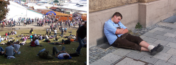 Вокруг комплекса со статуей, на склонах обширного холма, народ отдыхает в «лёжку». Мужчины в весёлых колпаках в виде бочонка с пивом, в шляпах с перьями, туристы и местные жители в костюмах — завсегдатаи фестиваля, честно напившись пива, расположились почти по всей длине западного склона холма. Да, в выходной день недели сюда лучше не приходить. Неподалёку расположился полицейский пост и их многочисленный транспорт. Однако, за все дни пребывания, мы ни разу не видели нарушений порядка. А полежать или поспать в любом месте города во время фестиваля — в норме…