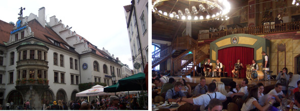 Мы решили в этот день пройтись по пиву в другом месте города, а лучше — пообедать. В Мюнхене имеется 4 больших пивных ресторана. Да и в любом обычном ресторане без пива — не останешься. Мы пошли по «Ленинским местам», а именно, выбрали знаменитый пивной дом Hofbräuhaus. Хофбройхауз был основан в 1589 году как «Придворная пивоварня». Рядом с ним находится другой пивной дом — «Августинер», есть ещё пивные дома: Löwenbräukeller, Hofbräukeller. Все марки пива, содержащиеся в этих названиях, представлены в Палатках Октоберфеста.
