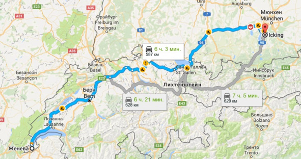 Наше новое путешествие на автомобиле по маршруту Женева–Мюнхен–Швангау–Женева (Genève–München (Munich) –Schwangau–Genève) состоялось в начале октября 2012 года. Уточню пункты отбытия и прибытия. Стартовали из городка Saint-Genis-Pouilly, France (Сан-Жени-Пуйи, Франция), расположенного рядом с Женевой. Таким образом, в дни выезда и приезда пересекали сразу территории 4-х стран: Франции, Швейцарии, Австрии, Германии (France — Suisse (Switzerland) — Österreich — Deutschland). Конечный пункт назначения в немецкой Баварии — частный отель в деревне Icking (Икинг), в 24 км южнее Мюнхена. В Icking мы прибыли через 8 часов фактического времени в пути. Обратная дорога (9 октября) заняла 7 часов 30 минут. В обе стороны останавливались на кофе и обеды.