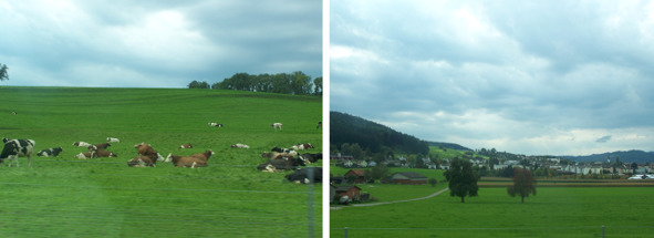 Дорога А1 через Берн до Цюриха проезжена нами в течение двух лет, а вот в сторону Боденского озера следуем впервые. То проглядывает солнце, то накрапывает дождь. Вокруг — идиллические пейзажи: стада коров, пасущихся или лежащих на склонах холмов; теснящиеся дома в селениях; прозрачные речушки.