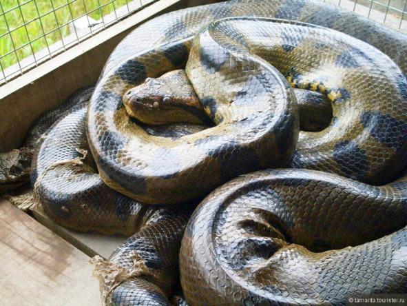 Ещё с одним необычным обитателем приёмника для животных мне посчастливилось встретиться. Жила здесь молодая анаконда, а ей всего пять метров. Тони пояснил, что анаконду поранил крокодил. Она ещё очень слаба, поэтому лежит без движения в своём просторном вольере, неспешно сбрасывает кожу и ждёт нас с фотоаппаратом.