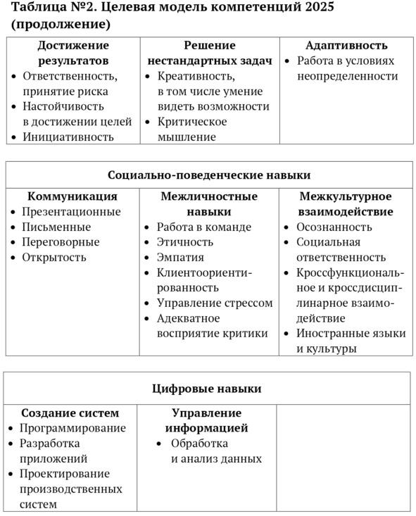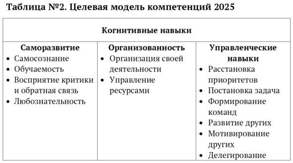 Агентства стратегических инициатив и МШУ «Сколково» спрогнозировали свою модель компетенций на 2025 год (таб. №2).