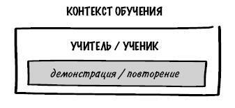 Если ученик не повторяет (и не важно – не может или не хочет) то, что ему продемонстрировали, то он не является учеником, и контекст Обучения не состоялся. Если учитель вместо демонстрации рассказывает, как он в 17-м брал Зимний или какой негодяй начальник транспортного цеха, то повторять нечего (разве что его байки). Опять же нет, да и не было контекста Обучения.