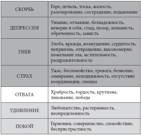 Основные эмоции – скорбь, страх, гнев, депрессия, отвага, удивление, радость, любовь и «покой позитивного безмолвия». Все это мы рассмотрим более подробно.