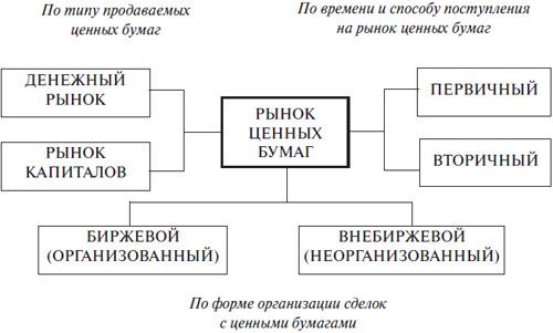 В зависимости от форм организации совершения сделок с ценными бумагами можно выделить биржевой (организованный) и внебиржевой (неорганизованный или «уличный») рынки ценных бумаг. Организованный рынок образуют фондовые биржи. Все остальные сделки с ценными бумагами осуществляются на неорганизованном рынке.