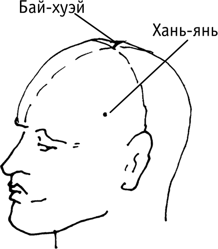 Бай-хуэй («соединение пересечений») расположена в центре темени, на пересечении срединной линии головы с линией, соединяющей кончики ушей. Воздействие на точку предотвращает головокружение, шум в ушах, помогает при частой одышке, сердцебиении, климактерических неврозах, артериальной гипертонии (рис. 3, б и рис. 3, г).