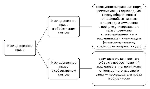 В объективном смысле под наследственным правом понимается совокупность правовых норм, регулирующих однородную группу общественных отношений, связанных с переходом имущества в порядке универсального правопреемства от наследодателя к его наследникам и иным лицам (отказополучателям, кредиторам умершего и др.).