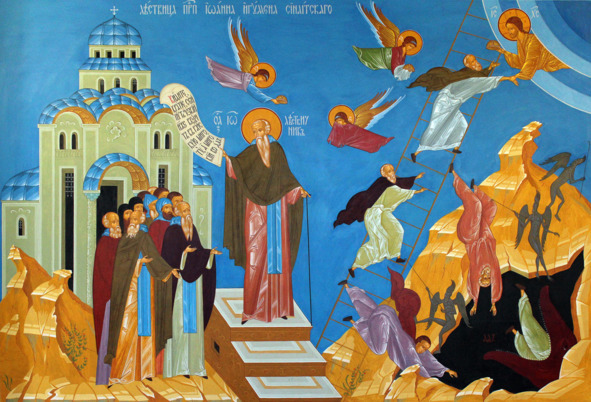 На земле за зыбкую лестницу постоянно идёт битва между белыми и иными ангелами, между их армиями, рекрутированными из мира людей. Немногим из мира людей удаётся подняться по лестнице в мир божий, но они становятся святыми и в полку белых ангелов прибывает воинов, лестница становится устойчивей.