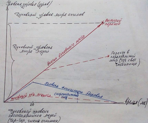Рядом с кривой физического здоровья идёт кривая здоровья духовного. Вместе они идут до тех самых 18-ти — 25-ти лет. Дальше духовное здоровье, в отличии от физического, продолжает расти и даже, возможно, с большим ускорением. Всё зависит от способностей самореализации человека. На каком-то уровне духовности оси ординат начинается новый мир. Если человек успел его достигнуть, душа переходит в новый ангельский чин нового мира. Если не успел, то в чистилище параллельного мира (тот свет) до страшного суда. Бывает и третий вариант, когда жизнь не сложилась, непокаянные жизненные ошибки слишком велики, тогда кривая духовного здоровья вместе с кривой физического упираются в абсциссу. Этот тупик называется «не сдал», извольте на принудительное поселение в Тартар (огромное болото около Вавилона, в России называли Тартарары). К сожалению, люди и народы время от времени попадают в подобные тупики. Из таких тупиков некоторых из них выводят революционные ситуации на уровне большой беды и следуемым за ним глубоким осмыслением, и покаянием. Большая беда у нас уже была, похоже свершилось и покаяние с постройкой храмов на Спаса на крови и Христа Спасителя, хотя кто знает — не нам судить. Я не религиовед, рассказываю, как понимаю, и могу где-то ошибаться. Да, впрочем, религии и не чертили таких графиков — это моя привычка с работы и с института. Зато так понятней будет. Примерно такую схему жизни предлагают все мировые религии, и да простят они меня за некоторые схематические или канонические погрешности.