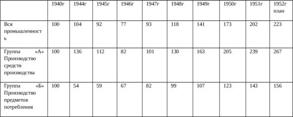 Из этих данных видно, что в 1945 и 1946 годах имело место снижение уровня промышленного производства. Это было связано с тем, что производство военной техники после окончания войны было резко сокращено, а перестройка промышленности на мирные рельсы требовала известного времени[6].