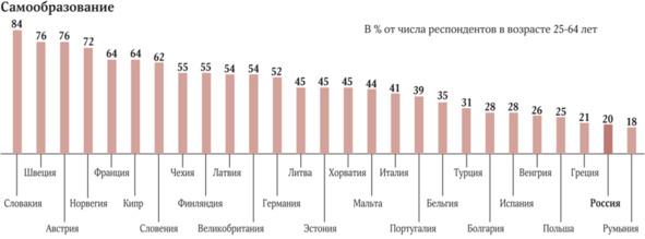 Чаще всего недавний студент становится сотрудником компании и его образование продолжается в лучшем случае на корпоративных тренингах. Но даже это хорошо. Ведь у других оно попросту останавливается. К сожалению, рейтинг самообразования в России невысок.