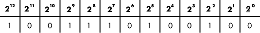 1 × 212 + 0 × 211 + 0 × 210 + 1 × 29 + 1 × 28 + 1 × 27 + 0 × 26 + 1 × 25 + 0 × 24 + 0 × 23 + 1 × 22 + 0 × 21 + 0 × 20 = 5028.
