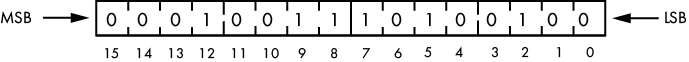 Крайний правый бит в двоичном числе называется наименьшим значащим битом, а крайний левый — наибольшим значащим битом, потому что изменение значения самого правого бита оказывает наименьшее влияние на значение числа, а изменение значения самого левого — наибольшее. Компьютерщики любят трехбуквенные аббревиатуры, или TLA (three-letter acronym), поэтому эти биты обычно называют LSB (least significant bit) и MSB (most significant bit) соответственно. На рис. 1.7 показан пример числа 5028, записанного в 16 битах.