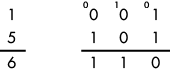 На самом деле сложение в двоичном формате немного проще, поскольку существуют только 4 возможные комбинации из 2 бит по сравнению со 100 комбинациями из 2 цифр. Например, на рис. 1.8 показано, как сложить 1 и 5, используя двоичные числа, с учетом цифр над каждым столбцом.
