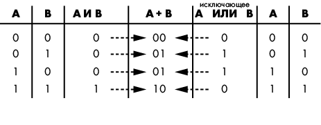 Рис. 1.9. Сложение двоичных чисел с использованием логических операций