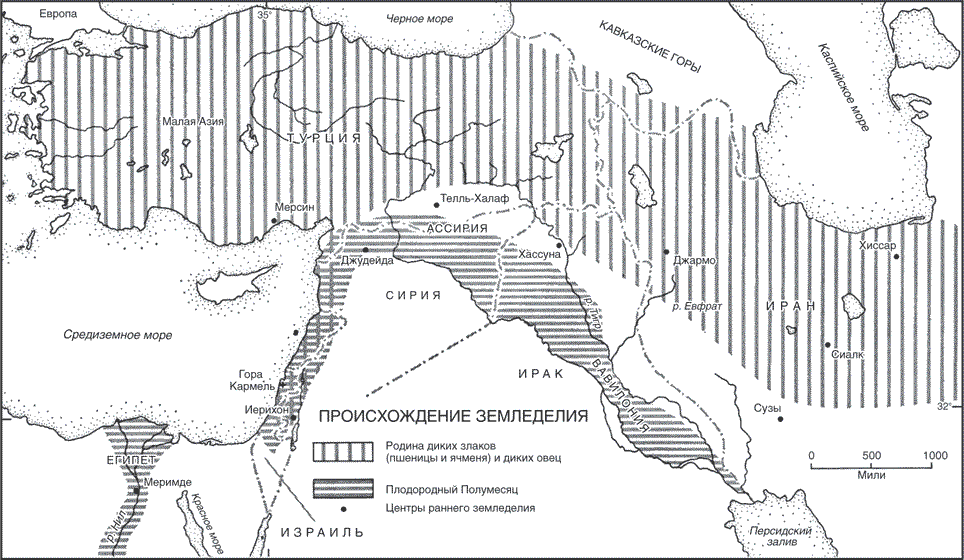 Как бы нам ни хотелось рассмотреть Джармо подробнее, оно не было единственным раннеземледельческим поселением на Среднем Востоке и не отражало полностью всех достижений человека на стадии выращивания пропитания. Важным аспектом этой ступени развития стало относительно быстрое распространение земледелия. Люди перешли к возделыванию земли по всему Среднему Востоку, где позволяли почва и количество осадков, от Ирана до Египта. К 4000 году до н. э. земледелие вместе со скотоводством стало основой образа жизни большей части местного населения.