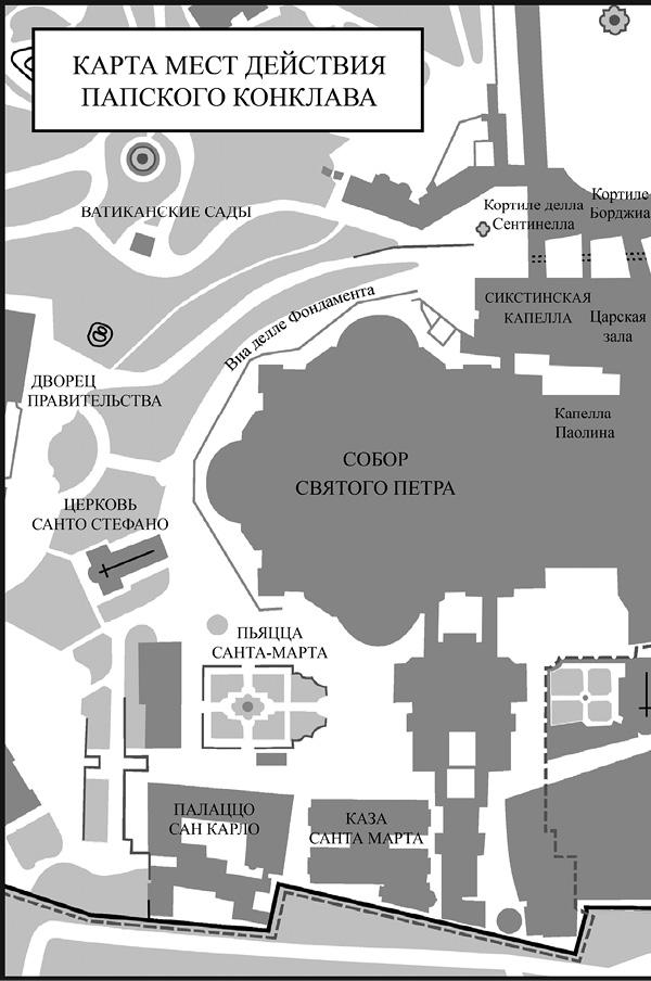 Ради достоверности я использовал в романе настоящие титулы и звания (архиепископ Милана, декан Священной Коллегии кардиналов и т. п.), но относиться к ним нужно так же, как вы отнеслись бы в художественном произведении к должности президента США или премьер-министра Великобритании. Характеры, которые я создал для исполнения этих обязанностей, не имеют ни малейшей аналогии с реальными духовными лицами; если же я ошибся и кто-то обнаружит какие-то случайные общие черты, то приношу свои извинения. Точно так же, несмотря на поверхностное сходство, у меня не было намерения создать портрет нынешнего святого отца, когда я описывал в «Конклаве» покойного папу римского.