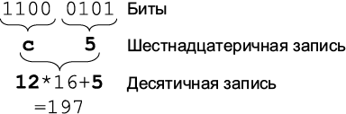 Бит — это наименьшая единица информации в компьютере. Бит может иметь одно из двух значений: 0 или 1. Подобно лампочке, он может быть включен или выключен. Байт — это группа или последовательность из 8 бит и может иметь 256 разных значений. Для изображения чисел в этой книге часто используется шестнадцатеричная форма записи. Каждый байт можно записать двумя шестнадцатеричными цифрами — от 0 до f, где a = 10 и f = 15.