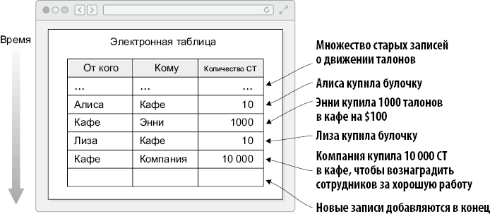 Рис. 2.2. В электронной таблице учета жетонов есть столбцы, определяющие отправителя и получателя, и есть столбец с числом переданных жетонов. Новые записи о движении жетонов добавляются в конец таблицы