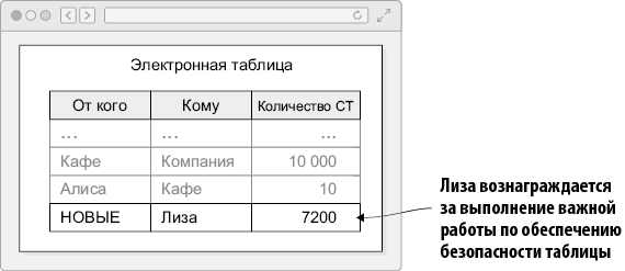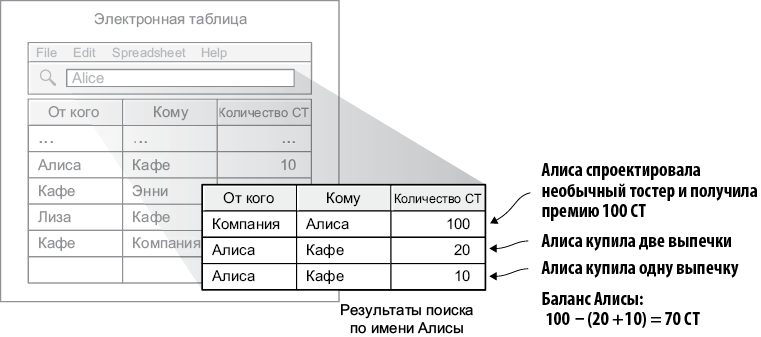 Всякий раз, когда Алиса хочет булочек, она просит Лизу, которая работает рядом с кафе, перевести 10 CT от Алисы в кафе. Лиза знает, кто такая Алиса, и, заглянув в электронную таблицу, может убедиться, что у нее достаточно жетонов; она выполнит поиск по имени «Алиса», сложит все числа в столбце «Кому» в записях с именем Алисы и вычтет из суммы все числа в столбце «От» в записях с именем Алисы. На рис. 2.3 изображены все результаты поиска; в таблице есть три записи с именем Алисы.