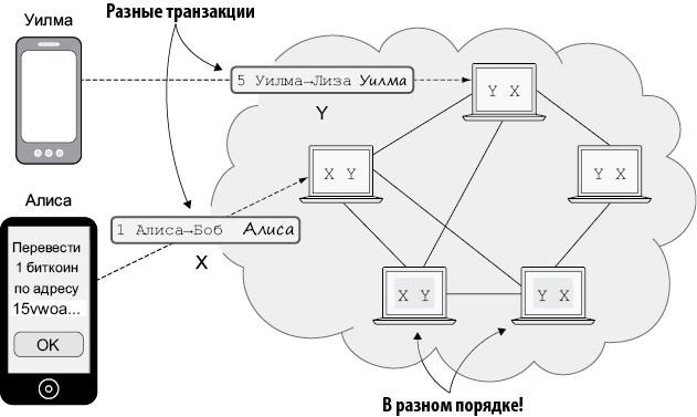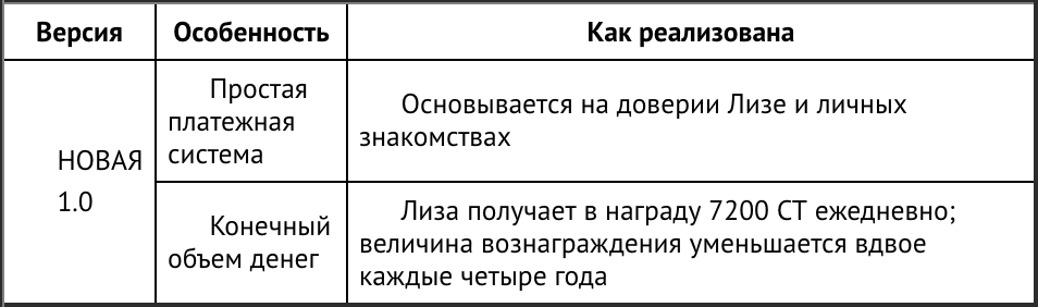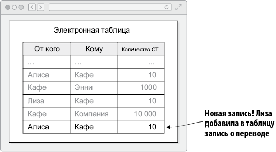 Фактически Лиза выполняет ту же работу, что и майнеры в сети Биткоин. Она проверяет платежи и обновляет консенсусный реестр — электронную таблицу учета жетонов на булочки. В табл. 2.1 поясняется, как идея электронной таблицы соответствует идее Биткоин.