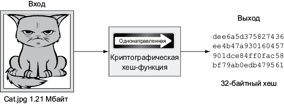 На выходе получается хеш — 256-битное число; 256 бит — это 32 байта, потому что 1 байт состоит из 8 бит. То есть, если сохранить число в файле, его размер составит 32 байта, что очень мало в сравнении с размером изображения кота, составляющим 1,21 Мбайта. В этом примере использовалась криптографическая хеш-функция, которая называется SHA256 (алгоритм безопасного хеширования с 256-битным результатом) и широко используется в Биткоин.