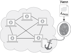 Цифровой документ имеет сигнатуру: криптографический хеш, который любой может вычислить по документу. Создание другого документа с той же сигнатурой практически невозможно. Эту сигнатуру можно прикрепить к платежу в биткоинах. Куда уходят деньги, не имеет значения; важно, что сигнатура сохранится в блокчейне Биткоин. Таким способом можно «привязать» документ к блокчейну.