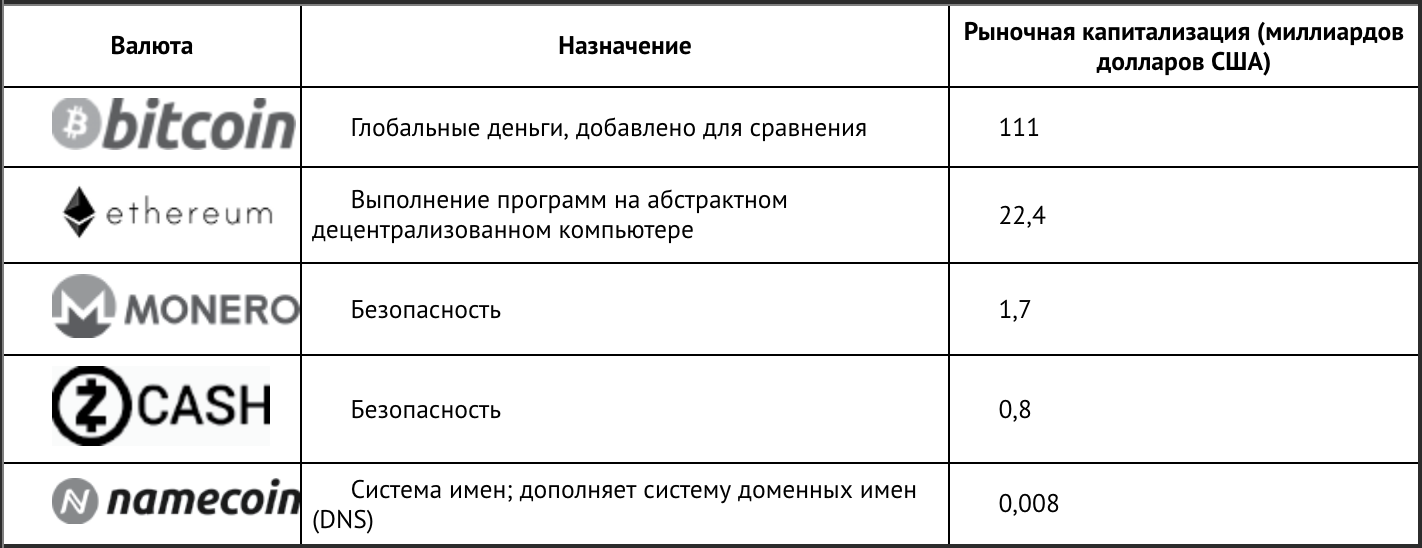 Эта книга рассказывает о Биткоин, но существует несколько других криптовалют и постоянно появляются новые. Криптовалюты, отличные от Биткоин, часто называют альткоинами (alt-coins), то есть альтернативными монетами. В табл. 1.4 я перечислил несколько альткоинов вместе с их назначением и рыночной капитализацией. Рыночная капитализация — это произведение денежной массы (количества монет) и текущей рыночной цены одной монеты. Обратите внимание, что рыночная капитализация, скорее всего, сильно изменится к тому времени, когда вы будете читать эти строки. Я включил эту информацию только для того, чтобы дать вам представление о положении Биткоин среди других криптовалют.