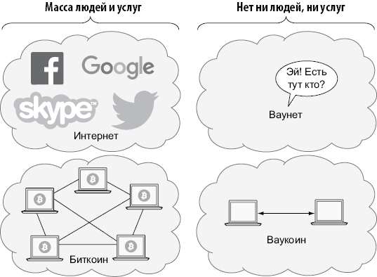 Допустим, Шейла решила создать альткоин под названием Ваукоин (Wowcoin). Она берет программное обеспечение Биткоин и уменьшает максимальную денежную массу с 21 000 000 до 11 000 000 монет. В момент запуска Ваукоин Шейла будет единственным пользователем, потому что пока никто не использует ее альткоины. Если она захочет, чтобы ее криптовалюта Ваукоин приобрела реальную ценность, ей придется убедить других начать использовать ее. Если она не предложит ничего инновационного, ей будет трудно привлечь других, потому их вполне устраивает Биткоин. Все остальные используют Биткоин, так зачем им использовать Ваукоин? Эту ситуацию можно сравнить с запуском нового Интернета, который вы называете Ваунет. Люди в Ваунете не смогут пользоваться услугами из Интернета. И наоборот, люди в Интернете не смогут использовать услуги из Ваунета. Так зачем кому-то использовать Ваунет? Мы называем это сетевым эффектом (рис. 1.14) — люди стремятся туда, где находятся другие люди.