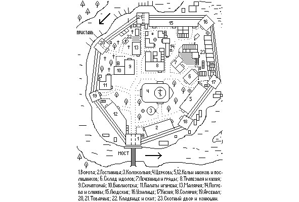 К третьему часу мы приблизились к стенам пригородной обители, заране явленной нам стаями галок (10) над брамами и крестами своими. Монастырь сей древний, являл собой семибашенный острог, срубленный из застоялого карпатского дуба, исчерневшего от веков и твердость железа приобретшего. Округ частокола высокого растекалась речушка, наполненная мутными водами, правда, изрядно заросшая осокой и камышом, но от того уж вовсе непроходимая, ибо являла болотистые топи. Подъемный цепной мост вел к тяжелым вратам, окованным железными пластинами. Неприступной с виду была обитель. А так как не заметили мы подновления стен и башен, то заключили, что враг обходил сей замок стороной. Спешившись, перекрестясь на надвратную иконку Спасителя, ступили мы под сень монастырских врат.