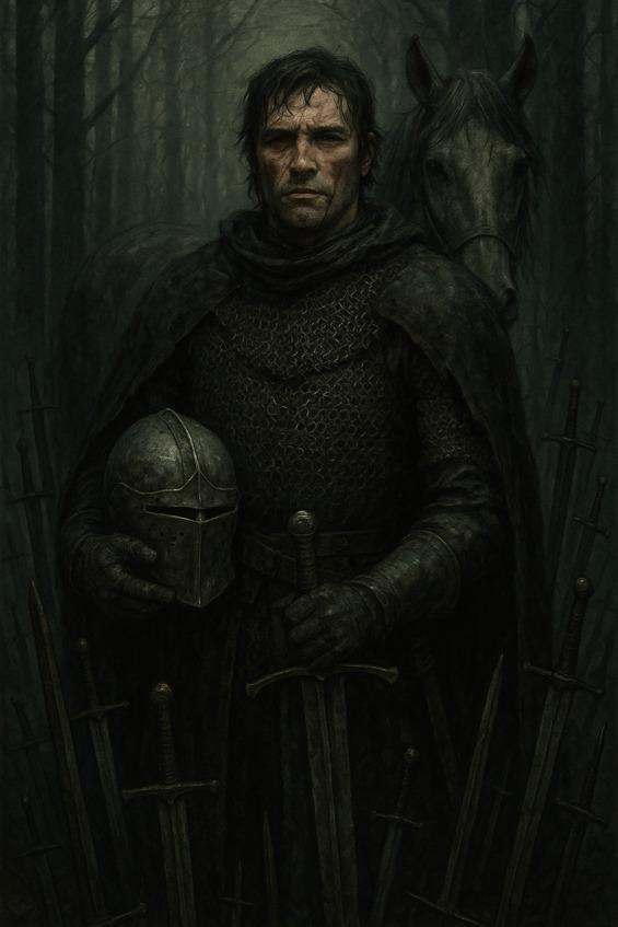 Он поднял забрало. На нас смотрело живое лицо — резкие скулы, обветренная кожа, как будто ее сушили не в одном походе. Серые глаза, цвета ледника на рассвете, хранили и лето, и тысячи чужих смертей. Ниже подбородка потянулся шрам, узловатый, как трещина на старом мече.