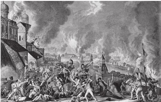 А пока французы начали обустраиваться в Москве. Наполеон обещал своим солдатам в начале кампании хорошие зимние квартиры, изобилие. И получается, сдержал слово. Французы нашли в Москве огромные запасы товаров. Мука, водка, вино, множество разных магазинов, в том числе суконных, меховых. И даже отбирать ни у кого ничего не нужно. Все просто так. Москвичей нет. Но не тут-то было. 14 сентября в Москве начался пожар. То есть ровно в тот день, когда Москву покинула русская армия и зашли французы. Просто они не сразу это заметили. Москва даже в начале XIX века была большая, а днем огонь они могли и не заметить. Еще утром 14 сентября Ростопчин приказывал «стараться истреблять все огнем», чем в общем подчиненные и занимались вплоть до вечера 14 сентября. Намерение сжечь Москву было не только у Ростопчина, но и у Кутузова.