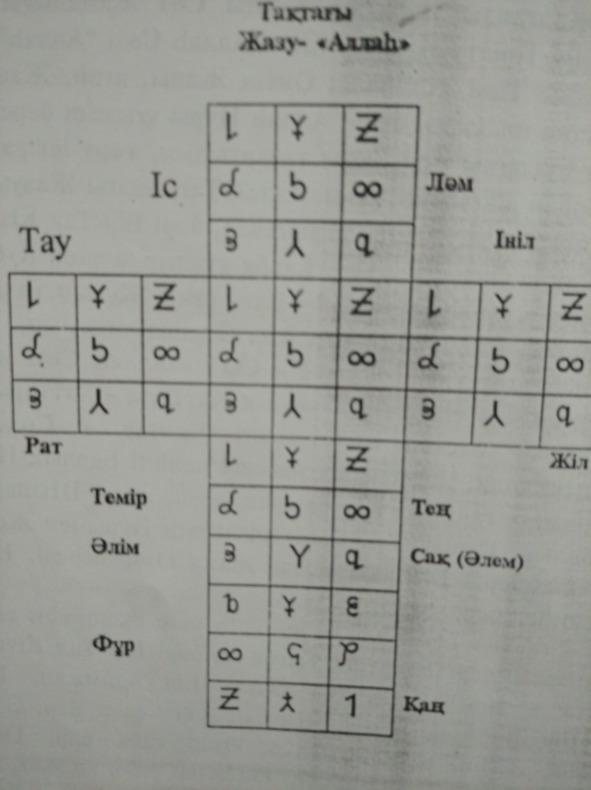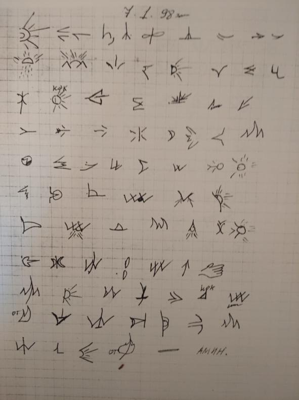 В бумагах покойного Нарбека (Нармухаммеда Арыстани) я обнаружил свыше десяти текстов, написанных таинственными знаками (иероглифами, идеограммами). Я обращался к разным людям, имеющим какое-либо отношение к древним письменам. Так, например, известный в Казахстане ученый-специалист по древнетюркским руническим памятниками Сарткожа Харжаубай сообщил мне, что предложенные для расшифровки тексты не написаны руническими знаками и он не сможет прочесть их.