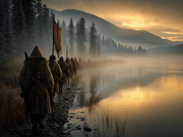 Их путь был долгим и трудным. День за днём казаки пробирались сквозь дремучие чащи, пересекали ветреные равнины, переходили холодные ручьи. Ночами они спали под звёздным небом: кто-то грел руки у костра, кто-то пел протяжные песни, а кто-то молчал, глядя ввысь, словно спрашивая у неба: «Где же наш край, что станет домом?»