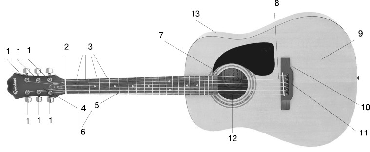 Кратко рассмотрим устройство шестиструнной гитары.
