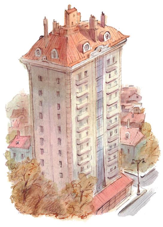 И так он важничал, что говорил сам себе: «Ого, какой же я огромный и высоченный. Выше меня во всём городе ни одного дома нет. А сколько удивительного внутри меня! В подвале прачечная, на первом этаже – магазин. Мало того, у меня лифт есть. Да-да, такой я роскошный, что во мне есть и лестница, и лифт, и когда кабинка ездит вверх-вниз, она так приятно щекочет меня сверху донизу, что я хихикаю: “хи-хи”. А какие люди во мне живут! О-го-го! И все они меня любят, но больше всех мной восхищается малыш с седьмого этажа».