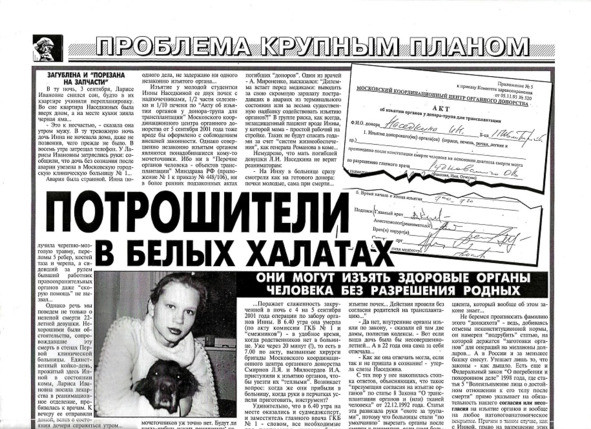 …Поражает слаженность закрученной в ночь с 4 на 5 сентября 2001 года операции по забору органов Инны. В 6.40 утра она умерла (по акту комиссии ГКБ №1 и «смежников») — в удобное время, когда родственников нет в больнице. Уже через 20 минут (!), то есть в 7.00 по акту, вызванные хирурги бригады Московского координационного центра органного донорства Смирнов Л. Я. и Милосердов И. А. приступили к изъятию органов, чтобы увезти их «теплыми». Возникает вопрос: когда же они прибыли в больницу, когда руки в перчатках успели приготовить, инструмент?
