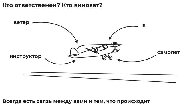 Осознавая ответственность, мы можем влиять на то, что с нами происходит. Приведу пример. Допустим, я учусь пилотировать самолет. Учебный полет, рядом со мной инструктор, я должен отработать посадку. Внезапно погода начинает меняться, и мы садимся при сильном боковом ветре. Я — пилот, инструктор наблюдает за моими действиями и бьет по рукам, если что. Погодные условия сложные, в итоге происходит довольно жесткая посадка. Кто виноват? Формально — инструктор, и, конечно, он несет за эту ситуацию ответственность. Однако, если я спрошу себя, каков мой вклад в это событие, что я должен был предусмотреть, что необходимо было сделать, я быстро приду к пониманию того, какое лично я имею отношение к произошедшему, какие мои действия способствовали такому развитию обстоятельств (рис. 1).